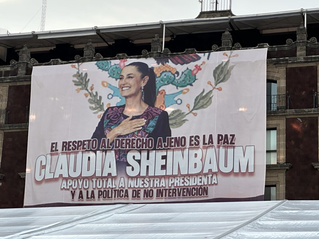 In the background is the main cathedral in the Zócalo Constitution Plaza.
