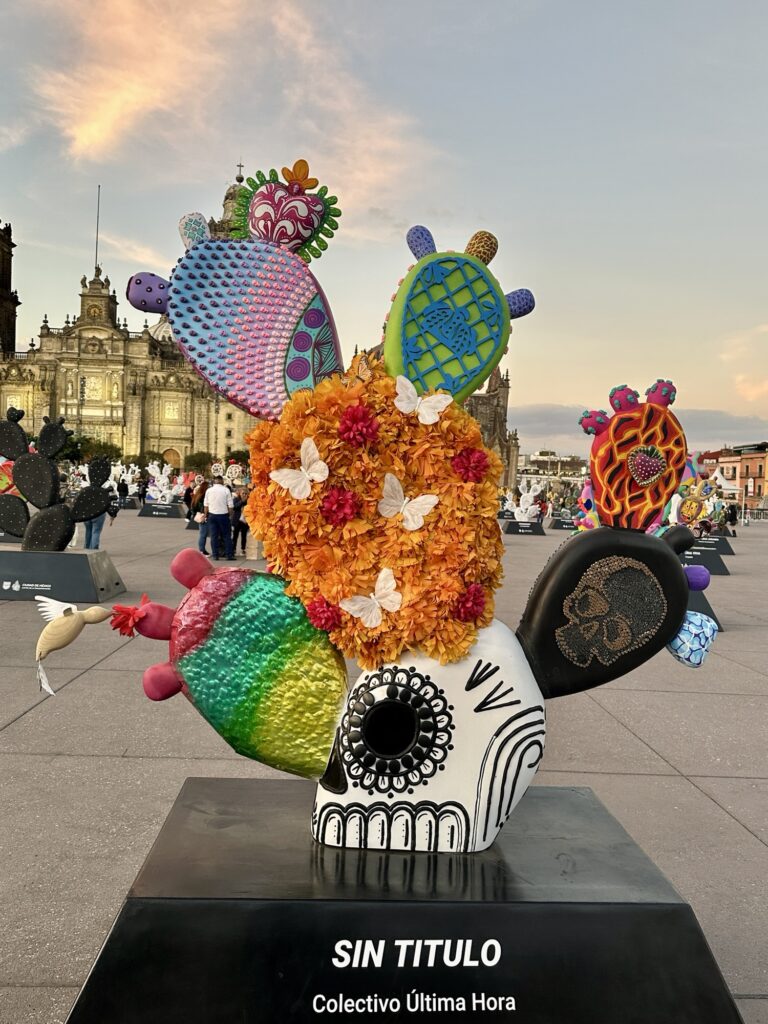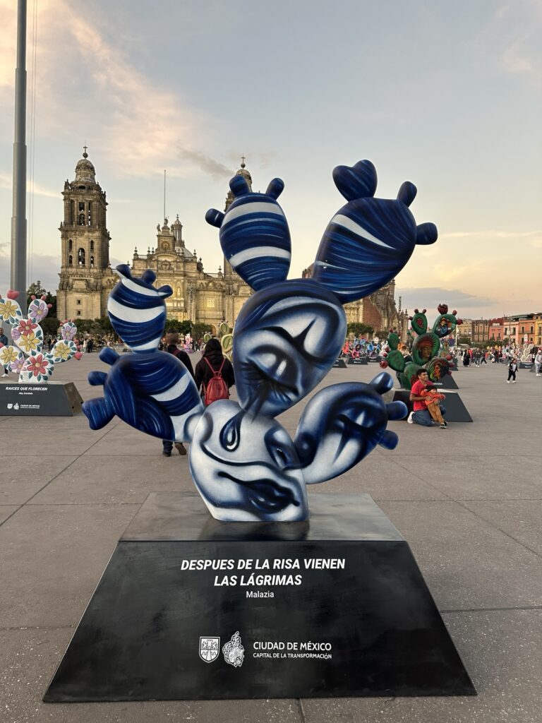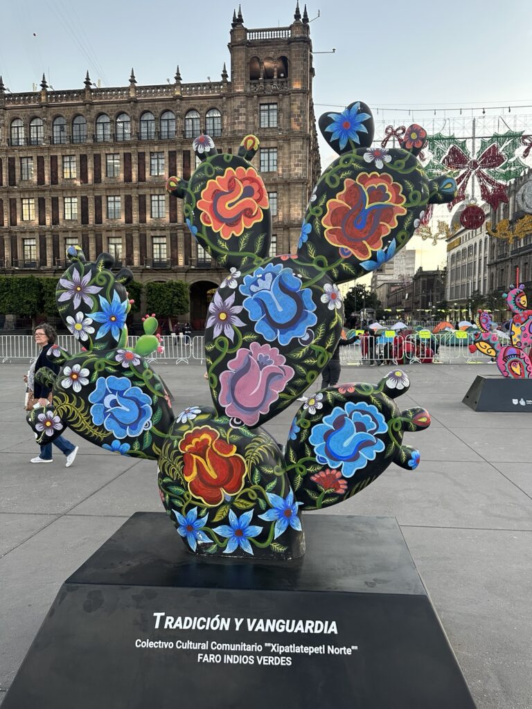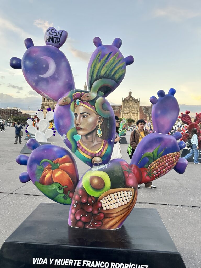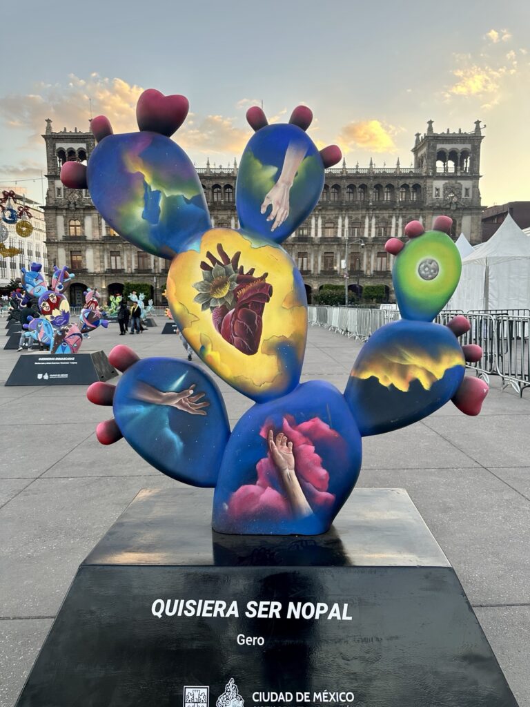There is currently an art exhibition in the main square called “Nopalera en el corazón” which means “prickly pear cactus in the heart”. There are around 200 Nopal cactus forms that have been designed and painted by various artists. While Michelle and Lola took at a look at the cathedral, I wandered among the Nopales. Each was more interesting than the next. It reminded me of the moose program similar to this that we had in Canada many years ago. Here are a sampling of the range of pieces that were designed: click on them individually if you would like to zoom in on any.