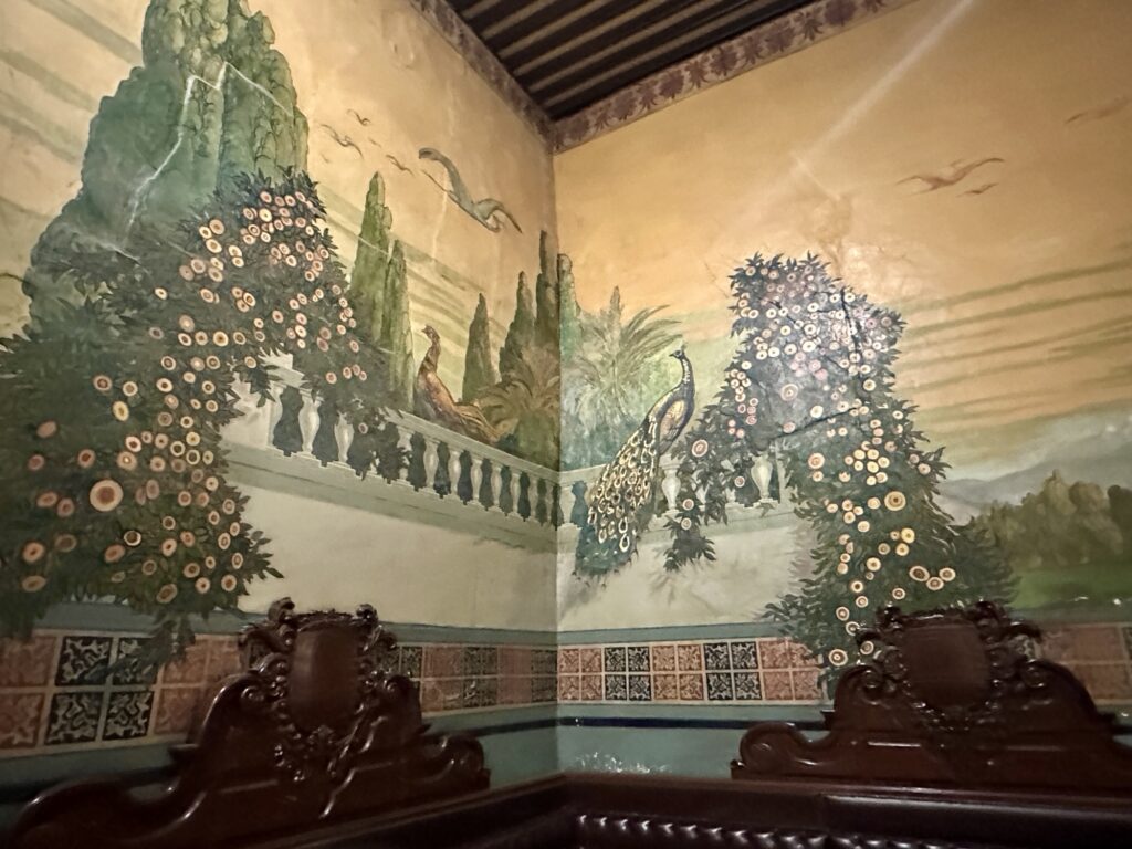 A stunning curved mural, one of several famous murals in the Castle.The Malachite roomThe tower with the rooftop gardenOne of the many stunning stained glass windowsOne exterior view Skull artifacts Fountain on the grounds